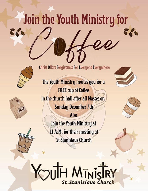 The Youth Ministry invites you for a FREE cup of Coffee in the church hall after all Masses on Sunday, December 7.